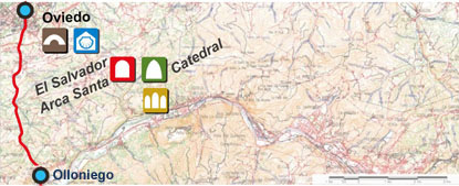 El Camín entra nel área urbana uviedina pel barriu de San Llázaro. Sigue les cais d’Armando Collar, La Malatería y Aurelio de Llano. Crucia Muñoz Degraín y pela cai de Leopoldo Alas accede al cascu históricu. El trayectu curtiu que resta va pela cai de La Madalena, plaza de la Constitución, Cimavilla y La Rúa pa desembocar na plaza d’Alfonso II. A la vista queda yá la catedral de San Salvador.