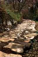 El trazado jacobeo asciende bordeando la base del pico Arnea y entronca con la carretera de Manzaneda. Se sigue por ella, a la izquierda, hasta alcan - zar un camino que se abre a la derecha y, con un excelente empedrado, sube a Picu Llanza.